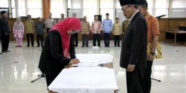 Ketua Bawaslu Provinsi Jawa Barat, Harminus Koto menyaksikkan penandatanganan pakta integritas anggota Panwaslukada pada acara pelantikan dan pengambilan sumpah/janji anggota Panwaslukada 2015 bertempat di Aula Gedung Korpri, Bandung (17/04).* Foto: Anton