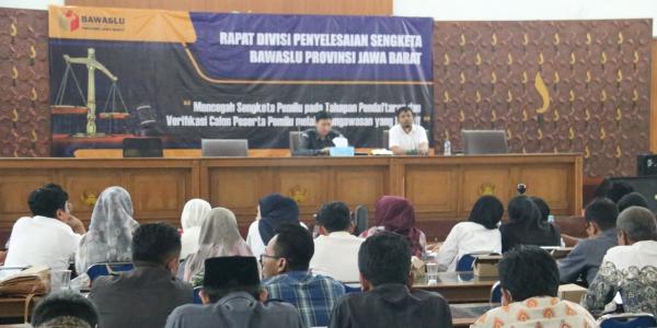 Bawaslu Jabar lakukan diskusi pemetaan terhadap potensi sengketa dalam Rapat Divisi Penyelesaian Sengketa Bawaslu Jabar dengan tema "Mencegah Sengketa Pemilu pada Tahapan Pendaftaran dan Verifikasi Calon Peserta Pemilu melalui Pengawasan yang Efektif" (26/7)