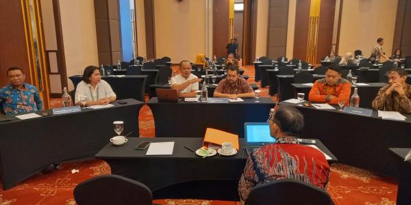 Koordinator Divisi Humas dan Data Informasi Muamarullah dan Plt. Kepala Bagian Hukum Humas dan Data Informasi Andhika Pratama melakukan presentasi tim keterbukaan informasi di hadapan panelis Arif Adi Kuswardono