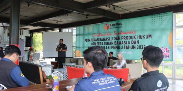 Bawaslu Provinsi Jawa Barat mengadakan Kegiatan Sosialisasi dan implementasi Peraturan Bawaslu dan Produk Hukum Non Peraturan Bawaslu dan kuliah regulasi Pemilu Tahun 2022 dengan mengundang para mahasiswa Fakultas Ilmu Sosial dan Ilmu Politik se Bandung Raya, Selasa 22 November 2022.